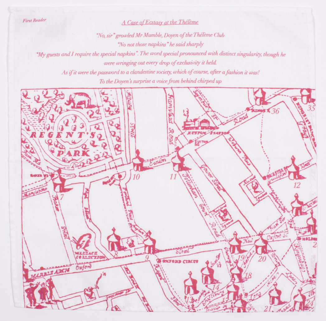 “Based on an original design from London’s infamous Thélème Club the map is a thinly disguised guide to cottaging in 1930’s London. On them, public lavatories are marked alongside popular tourist attractions, such as London Zoo and Westminster Abbey. The toilets are charmingly represented by what appears to be jousting tents, perhaps intended to invoke a suggestion of two knights coming together wielding their erect lances. Mirroring this theme, two lavatory attendants, brandishing toilet brushes, can be seen reclining in the foreground.”